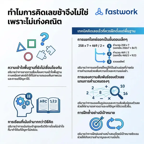 บทความนี้จะค่อยๆ พาไปทำความเข้าใจแนวคิดเบื้องหลังการคิดเลขเร็ว เทคนิคการมองโจทย์ และทางลัดคำตอบที่เกิดจากความเข้าใจจริง เพื่อช่วยให้การเรียนคณิตศาสตร์เป็นระบบและจับต้องได้มากขึ้น โดยสามารถอ่านแนวทางเพิ่มเติมควบคู่กันได้ที่นี่