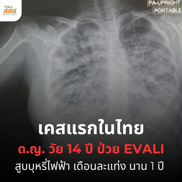 กรณีจริงที่น่าตกใจ : เคสแรกในไทยเด็กหญิงวัย 14 ปี ป่วยเป็น EVALI หลังจากเริ่มสูบพอดตั้งแต่อายุ 13 ใช้เดือนละหนึ่งแท่ง สูบประมาณ 9,000 ครั้งต่อเดือน หยุดเพียง 2 เดือนก็เริ่มมีอาการเหนื่อย หายใจลำบาก จนต้องเข้ารักษาและได้รับการวินิจฉัยว่าเป็น EVALI