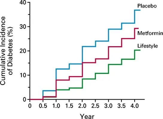งานวิจัยที่ตีพิมพ์ใน National Library Health of Medicine แสดงให้เห็นว่า การออกกำลังกายสม่ำเสมอ ช่วยลดความเสี่ยงการเกิดโรคเบาหวานชนิดที่ 2 อย่างมีนัยยะสำคัญ จากงานวิจัย และกราฟด้านล่าง แสดงการติดตามความเสี่ยงของการเกิดโรคเบาหวาน ของ คน 3 กลุ่ม ตลอดช่วงเวลาที่ติดตามผล พบว่า อัตราการเกิดโรคเบาหวานสะสม ในกลุ่มที่ทำโปรแกรมปรับพฤติกรรม (Lifestyle Intervention) เสี่ยงต่ำกว่ากลุ่ม ยาหลอก (Placebo) และต่ำกว่ากลุ่ม รับยารักษา (Metformin) ตามภาพ