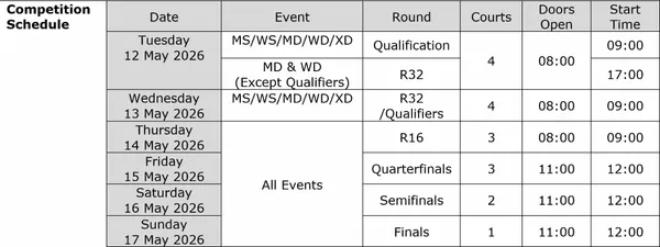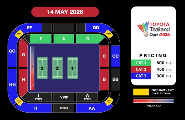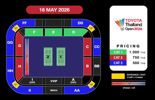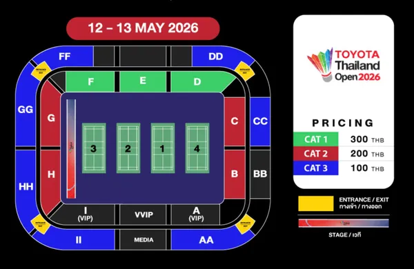 สำหรับการเปิดจำหน่ายบัตรวันแรก เริ่มตั้งแต่วันพฤหัสบดีที่ 23 เมษายน 2569 เวลา 10.00 น. ที่ผ่านมา แฟนแบดมินตันที่สนใจสามารถเลือกซื้อบัตรได้ทางเว็บไซต์ www.thaiticketmajor.com รวมถึงจุดจำหน่ายของไทยทิคเก็ตเมเจอร์ 11 สาขาหลัก และทุกช่องทางจำหน่ายทั่วประเทศ โดยราคาบัตรเข้าชมแบ่งตามโซนที่นั่ง ดังนี้: