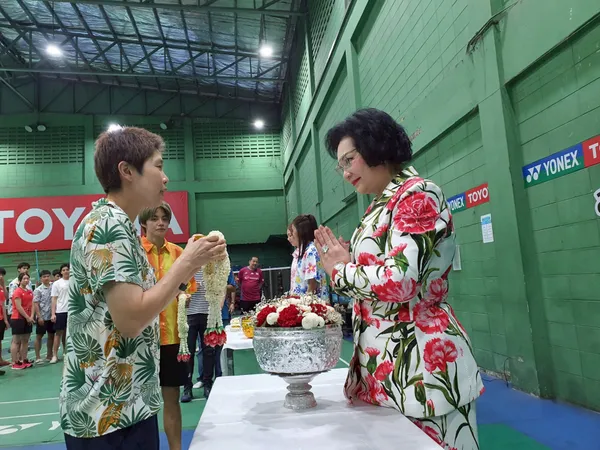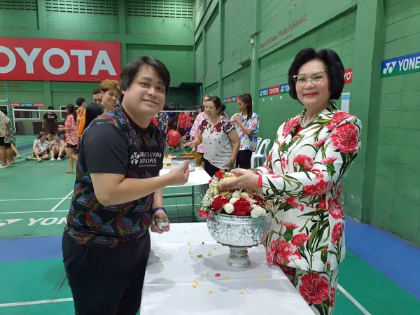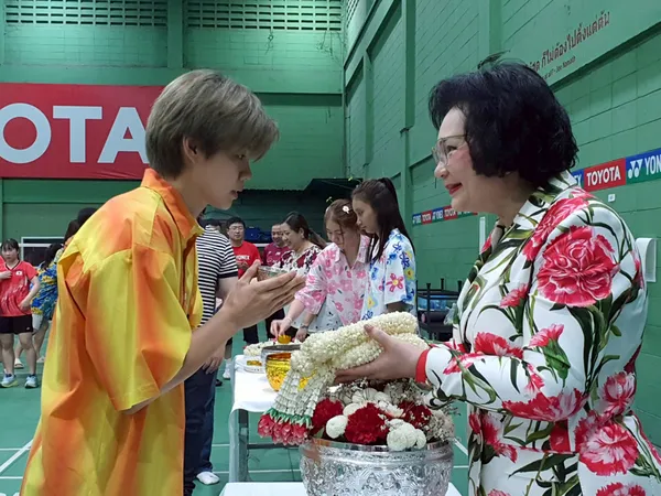 เมื่อช่วงเย็นของวันเสาร์ที่ 12 เม.ย.68 ที่ผ่านมา นักกีฬาแบดมินตันทีมชาติไทย รวมถึงทีมงานสต๊าฟโค้ชอย่าง และกรรมการบริการสมาคมฯ ได้ทำกิจกรรมร่วมสืบสานประเพณีไทยด้วยการเข้ารดน้ำขอพร คุณหญิงปัทมา ลีสวัสดิ์ตระกูล รองประธานสหพันธ์แบดมินตันโลก และ นายกสมาคมกีฬาแบดมินตันแห่งประเทศไทย เนื่องในโอกาสเทศกาลสงกรานต์ ปีใหม่ไทย ประจำปี 2568 ที่สมาคมกีฬาแบดมินตันแห่งประเทศไทย สวนลุมพินี ท่ามกลางบรรยากาศที่เรียบง่าย และอบอุ่น นอกจากนี้ ได้มีโครงการนักกีฬาแลกเปลี่ยนของประเทศญีปุ่น ทั้งโค้ชและนักกีฬาญี่ปุ่น ก็ได้ร่วมกิจกรรมครั้งนี้ด้วย โดยได้สาดน้ำกันอย่างสนุกสนานในช่วงท้ายกิจกรรม
