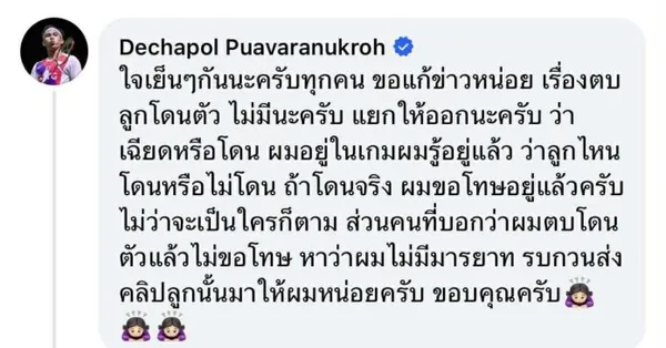 “ใจเย็นๆ กันนะครับทุกคน ขอแก้ข่าวหน่อย เรื่องตบลูกโดนตัว ไม่มีนะครับ แยกให้ออกนะครับ ว่าเฉียดหรือโดน ผมอยู่ในเกมผมรู้อยู่แล้ว ว่าลูกไหนโดนหรือไม่โดน ถ้าโดนจริง ผมขอโทษอยู่แล้วครับ ไม่ว่าจะเป็นใครก็ตาม ส่วนที่บอกว่าผมตบโดนตัวแล้วไม่ขอโทษ หาว่าผมไม่มีมารยาท รบกวนส่งลูกนั้นมาให้ผมหน่อยครับ ขอบคุณครับ”