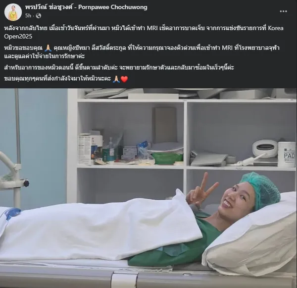 "หมิว" พรปวีณ์ ช่อชูวงศ์ มือ 6 ของโลก อัพเดตอาการบาดเจ็บกล้ามเนื้อขาซ้ายหลังถอนตัวจาก โคเรีย โอเพ่น ล่าสุดเผยดีขึ้นตามลำดับ พร้อมขอบคุณ "คุณหญิงปัทมา" ดูแลการรักษา หวังกลับมาซ้อมเร็วๆ นี้