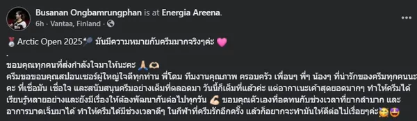 หลังจบการแข่งขัน นักตบลูกขนไก่สาวไทยได้โพสต์ข้อความผ่านเฟซบุ๊กส่วนตัว “Busanan Ongbamrungphan” ขอบคุณทุกแรงใจที่ส่งมาสนับสนุน โดยระบุว่า