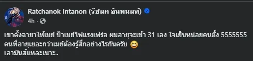 อย่างไรก็ตาม เมย์ รัชนก ก็ได้โพสต์ข้อความผ่านเฟซบุ๊กส่วนตัว Ratchanok Intanon (รัชนก อินทนนท์) ในเชิงตั้งคำถามถึงการตั้งฉายาของสมาคมฯ ในครั้งนี้ว่า “เขาตั้งฉายาให้เมย์ ป้าเมย์ไฟแรงเฟร่อ ผมอายุจะเข้า 31 เอง ใจเย็นหน่อยคนตั้ง คนที่อายุเยอะกว่าเมย์ต้องรู้สึกอย่างไรกันครับ เอามันส์แหละเนาะ..”