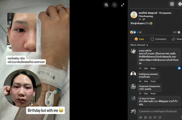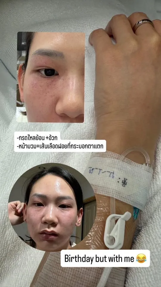 หมิว พรปวีณ์ วัย 27 ปี ได้โพสต์ภาพผ่านอินสตาแกรมส่วนตัว เผยให้เห็นขณะที่กำลังพักฟื้นและต้องให้น้ำเกลือ รวมถึงภาพใบหน้าที่มีอาการบวมและมีรอยเลือดฝาดบริเวณดวงตา โดยระบุข้อความว่า “กรดไหลย้อน+อ้วก หน้าบวม+เส้นเลือดฝอยที่กระบอกตาแตก Birthday but with me”