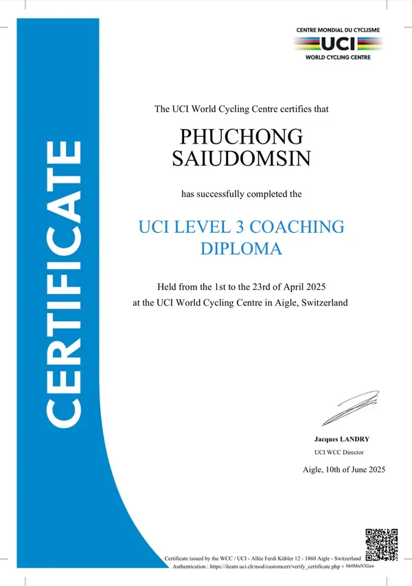 “เสธ.หมึก” พลเอกเดชา เหมกระศรี รองประธานสมาพันธ์จักรยานแห่งเอเชีย (ACC), ประธานสหพันธ์จักรยานแห่งอาเซียน (ACF) และนายกสมาคมกีฬาจักรยานแห่งประเทศไทย ในพระบรมราชูปถัมภ์ เปิดเผยว่า ตามที่สมาคมกีฬาจักรยานฯ ได้ส่ง “โค้ชบาส” พ.อ.อ.ภุชงค์ ซ้ายอุดมศิลป์ ผู้ฝึกสอนกีฬาจักรยานทีมชาติไทย เข้ารับการอบรมหลักสูตรผู้ฝึกสอนจักรยานระดับสูง (Level 3) ซึ่งเป็นหลักสูตรระดับสูงสุดของสหพันธ์จักรยานนานาชาติ (UCI) เมื่อวันที่ 1-23 เมษายน ที่ผ่านมา ณ ศูนย์ฝึกจักรยานโลก (WCC) เมืองเอเกิล ประเทศสวิตเซอร์แลนด์ ซึ่งเมื่อผ่านการอบรมแล้วจะสามารถเป็นผู้ฝึกสอนจักรยานได้ทั่วโลก ล่าสุด ทาง UCI ได้แจ้งว่า พ.อ.อ.ภุชงค์ ผ่านการอบรมหลักสูตรอย่างครบถ้วน พร้อมส่งใบประกาศนียบัตรรับรองการเป็นผู้ฝึกสอนระดับสูงสุดมาให้แก่ พ.อ.อ.ภุชงค์ เรียบร้อยแล้ว