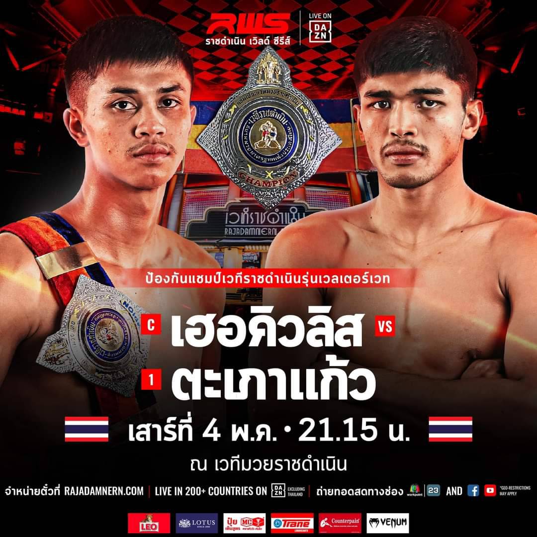 ศึก RWS วันเสาร์ที่ 4 พฤษภาคมนี้ คู่เอกของรายการนำโดยศึกสายเลือดมวยใต้ เฮอคิวลิส ว.จักรวุฒิ ขึ้นป้องกันแชมป์รุ่น 147 ปอนด์ของเวทีราชดำเนินกับขุนเข่าวัวชน ตะเภาแก้ว สิงห์มาวิน โดยไฟต์นี้ถือเป็นการล้างตากันจากเมื่อ 2 ปีก่อนที่ทางฝั่งตะเภาแก้วเคยเอาชนะคะแนนเฮอคิวลิสไปได้