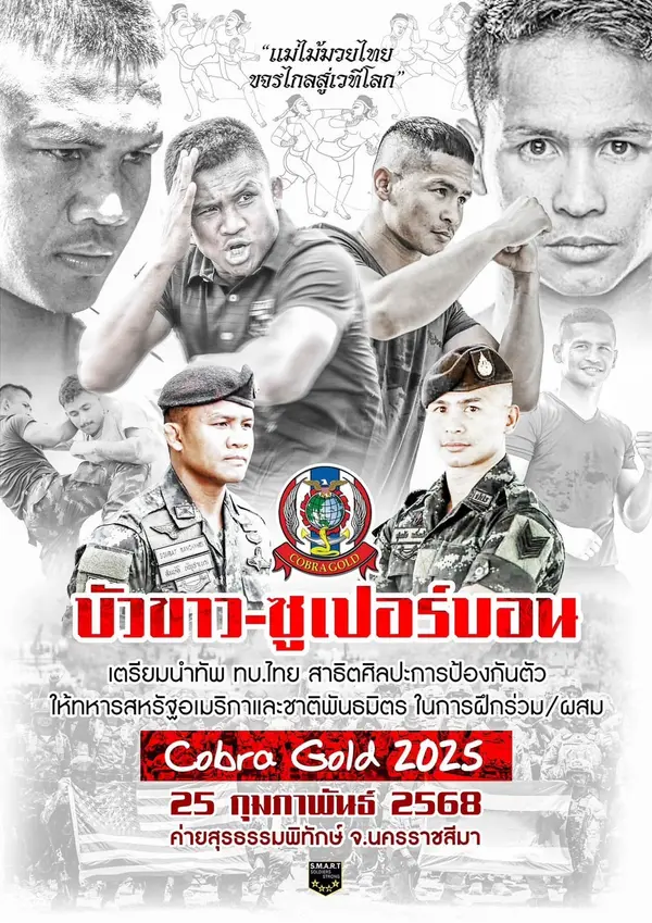 กองทัพบกไทยนำโดย ร้อยเอก สมบัติ บัญชาเมฆ (บัวขาว) และ ซูเปอร์บอน บัญชาเมฆ โดยทั้งคู่สังกัดศูนย์การกำลังสำรอง หน่วยบัญชาการรักษาดินแดน จัดการสาธิตแลกเปลี่ยนศิลปะการป้องกันตัวและแม่ไม้มวยไทยให้แก่ทหารสหรัฐฯ ในการฝึกร่วมผสม Cobra Gold 2025 ณ ค่ายสุรธรรมพิทักษ์ จ.นครราชสีมา วันที่ 25 กุมภาพันธ์ 2568