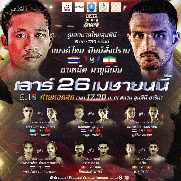 รายการ LWC SUPER CHAMP (ลุมพินีเวิลด์ แชมเปี้ยนชิพ ซุปเปอร์แชมป์) ถ่ายทอดสดจากลุมพินี มวยไทย อารีน่า (LUMPINEE MUAYTHAI ARENA) ถนนรามอินทรา ยังคงจับมือกับการกีฬาแห่งประเทศไทย เพื่อสนับสนุนนักกีฬามวยไทย ยกระดับศิลปะการต่อสู้มวยไทยสู่สากล มวยไทย Soft Power ที่ยิ่งใหญ่ กับคู่มวยซูเปอร์ไฟต์ ที่จะระอุไปด้วยรสชาติของมวยไทยที่สุดตื่นเต้น โดย คู่เอก เป็นการพบกันกำหนด 5 ยก พิกัด 139 ปอนด์ ระหว่าง "แบงค์ไทย ศิษย์สั่งปราบ" มวยฝีมือ ศอกคมจากร้อยเอ็ด พบ อาเหม็ด มาซูมีเนีย เปอร์เซียกำปั้นโหด พร้อมด้วยคู่มวยประกอบรายการสุดระทึกดังนี้
