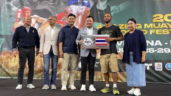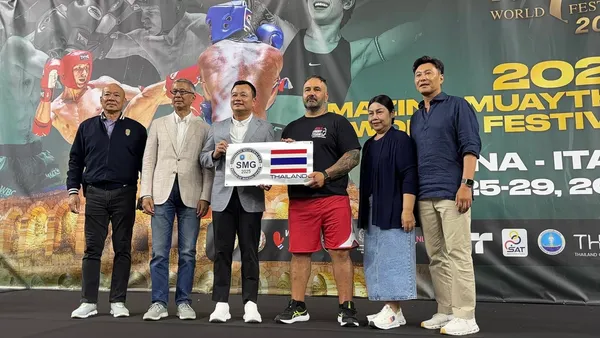สรวงศ์ เทียนทอง รัฐมนตรีกระทรวงท่องเที่ยวและกีฬา พร้อมด้วย ผศ.พิมล ศรีวิกรม์ ประธานโอลิมปิกไทย และ รองผู้ว่าการกกท. ให้กำลังใจนักมวยเยาวชนไทย ชุดสู้ศึก "อะเมซิ่งมวยไทยเวิลด์เฟสติวัล 2025" เวโรนา อิตาลี พร้อมส่งเสริมและมอบเครื่องหมาย SMG เพื่อแสดงถึง มาตรฐานยิมมวยไทยให้กับผู้ประกอบการ