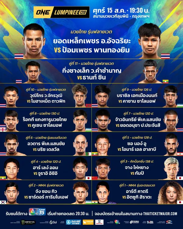 โปรแกรมการแข่งขันทุกคู่ศึก ONE ลุมพินี 120