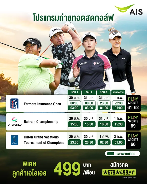 แฟนกอล์ฟห้ามพลาด! AIS PLAY ยิงสด 3 ทัวร์นาเมนต์ยักษ์ LPGA, PGA และ DP World Tour ร่วมเชียร์ โปรจีน อาฒยา และ โปรอาร์ม กิรเดช ล่าแชมป์พร้อมกัน 29 ม.ค. นี้