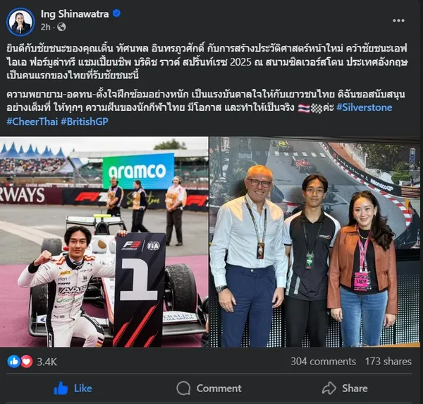 น.ส.แพทองธาร ชินวัตร รัฐมนตรีว่าการกระทรวงวัฒนธรรม โพสต์ข้อความผ่าน เฟซบุ๊กส่วนตัว แสดงความยินดีกับ “เติ้น” ทัศนพล อินทรภูวศักดิ์ นักแข่งรถดาวรุ่งชาวไทยวัย 18 ปี ที่สร้างประวัติศาสตร์หน้าใหม่ให้วงการมอเตอร์สปอร์ตไทย ด้วยการคว้าชัยชนะในรอบ สปรินต์เรซ ศึก FIA Formula 3 บริติช ราวด์ 2025 ณ สนาม ซิลเวอร์สโตน ประเทศอังกฤษ