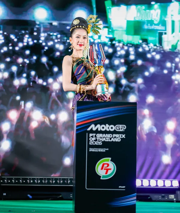 ไฮไลต์สำคัญภายในงานคือการเผยโฉม “โทรฟี่โมโตจีพี สนามประเทศไทย” ซึ่งได้รับการออกแบบเชิงสัญลักษณ์ภายใต้แนวคิดการจุดคบเพลิงแห่งการเริ่มต้นฤดูกาลใหม่ ตัวถ้วยส่วนบนถ่ายทอดรูปทรง Track Layout ของ สนามช้างฯ เคลือบสีธงชาติไทย ผสานลายผ้าพระราชทาน “สิริวชิราภรณ์” สะท้อนพลังวัฒนธรรมท้องถิ่นสู่สายตาชาวโลก