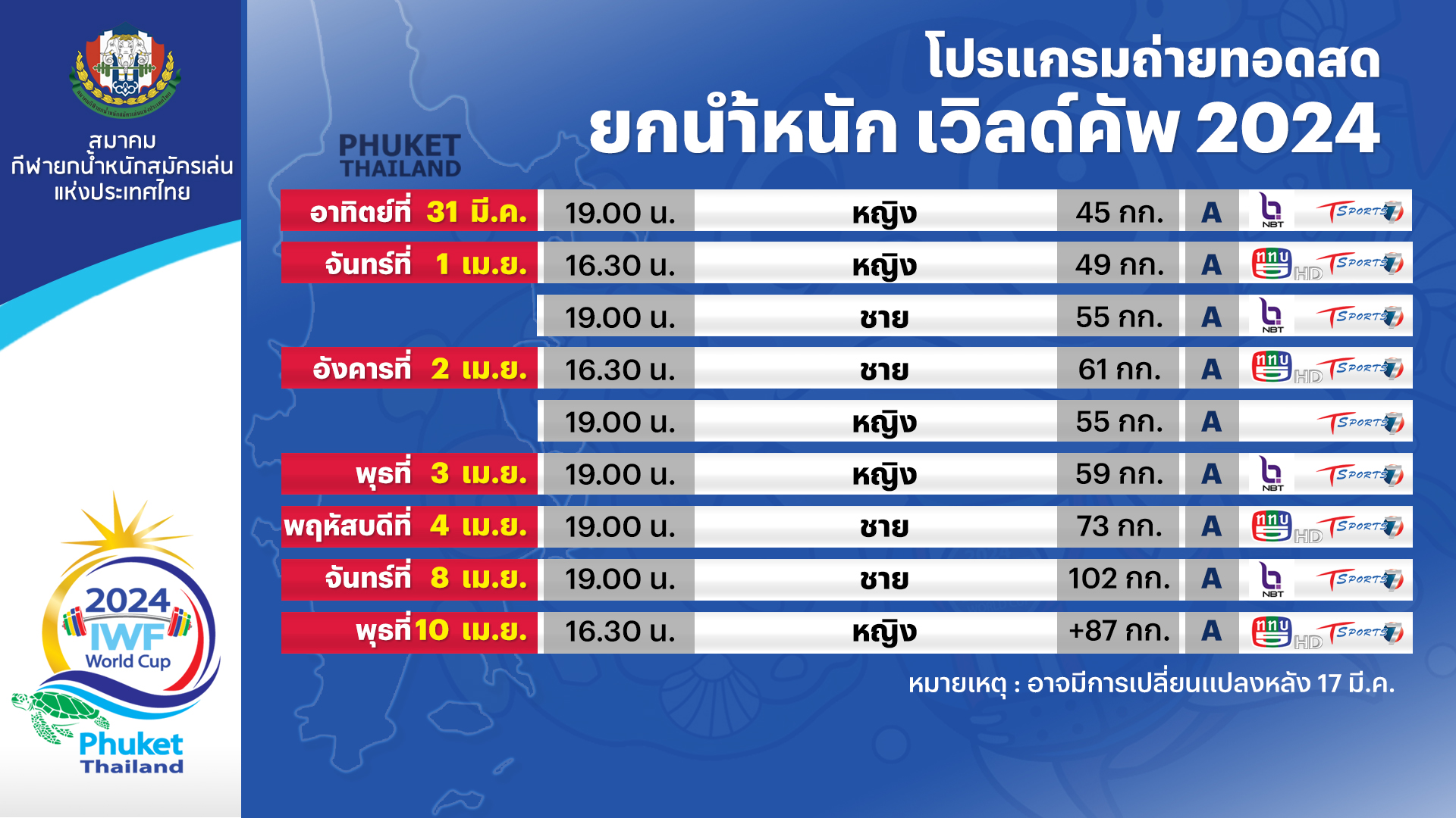 ล่าสุดฝ่ายจัดการแข่งขัน ได้เปิดเผยถึงโปรแกรมการถ่ายทอดสดในรายการนี้ ออกมาเป็นที่เรียบร้อยแล้ว โดย ช่อง 5 เอชดี, เอ็นบีที และ ที สปอร์ตส 7 จะสลับสับเปลี่ยนหมุนเวียน กันทำหน้าที่ให้แฟนกีฬาได้รับชม ได้เชียร์ จอมพลังระดับโลก และนักยกลูกเหล็กของไทย ตรงมาจากจังหวัดภูเก็ต