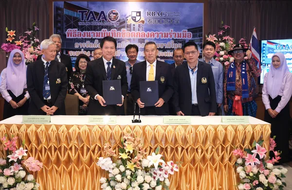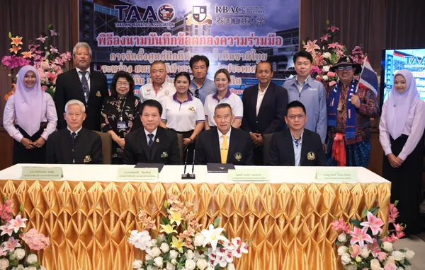 นายมนตรี ไชยพันธุ์ รองอธิการบดีอาวุโส ม.รัตนบัณฑิต และ พล.ต.ธนนท์ แสงนาค อุปนายกฝ่ายเทคนิค สมาคมกีฬาทางน้ำแห่งประเทศไทย ร่วมลงนามบันทึกข้อตกลงความร่วมมือในการจัดตั้งศูนย์ฝึกกีฬาทางน้ำทีมชาติไทย ระหว่างอาร์แบค กับ สมาคมกีฬาทางน้ำฯ เมื่อวันที่ 7 พ.ค.2568 ที่ห้องสินธุเดชะ มหาวิทยาลัยรัตนบัณฑิต(อาร์แบค)