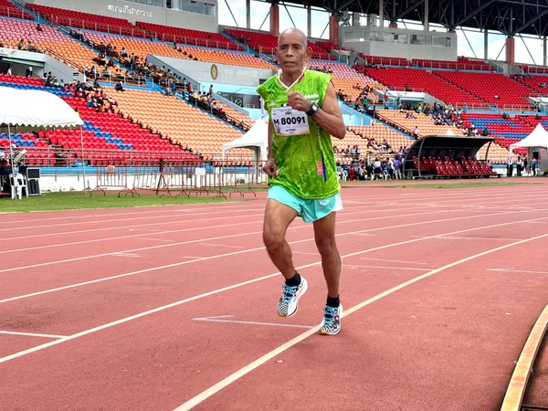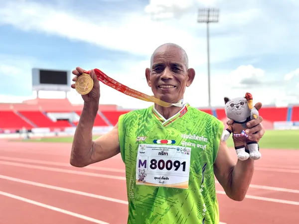 สุคนธ์ เกื้อเล้ง นักวิ่งรุ่นเก๋าจากสระบุรี ผงาดคว้าเหรียญทองแรกของ “โคราชเกมส์” กีฬาผู้สูงอายุฯ ครั้งที่ 17 ด้วยเวลา 25.59.95 นาที ในประเภทวิ่ง 5,000 เมตร ชาย รุ่นอายุ 80 ปีขึ้นไป