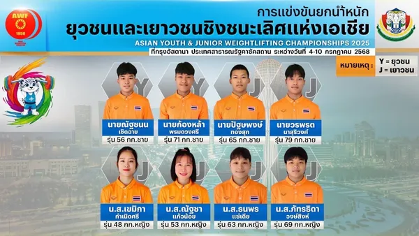 สมาคมกีฬายกน้ำหนักสมัครเล่นแห่งประเทศไทย เตรียมส่งจอมพลังทีมชาติไทยดาวรุ่งชายและหญิง รวม 8 คน เข้าร่วมการแข่งขันยกน้ำหนักยุวชนและเยาวชนชิงชนะเลิศแห่งเอเชีย 2025 (Asian Youth & Junior Weightlifting Championships 2025) ซึ่งจะจัดขึ้นระหว่างวันที่ 4–10 กรกฎาคม 2568 ณ กรุงอัสตานา ประเทศคาซัคสถาน โดยมีกำหนดออกเดินทางในวันที่ 1 กรกฎาคมนี้