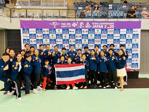 ทัพนักคาราเต้ทีมชาติไทยโชว์ฟอร์มเยี่ยม กวาด 8 เหรียญทอง 2 เหรียญเงิน และ 4 เหรียญทองแดง จากศึกคาราเต้ โกจู-ไค โกลบอล แชมเปี้ยนชิพ 2025 ที่เมืองชิบะ ประเทศญี่ปุ่น ระหว่างวันที่ 6-11 สิงหาคม 2568 ยืนยันศักยภาพสู่เวทีระดับโลก