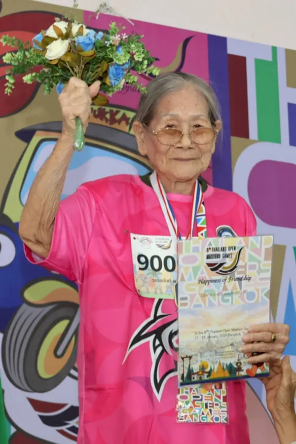 ขณะที่รุ่น 90-94 ปี หญิง วรรธนันท์ พลอยแหวนรัตนา วัย 90 ปี จาก จ.ชลบุรี นักกีฬาหญิงไทยที่อายุมากที่สุด คว้าเหรียญทองที่ 2 จากทุ่มน้ำหนักหญิง สถิติ 3.21 เมตร ส่วนลูกชาย สัมฤทธิ์ พลอยแหวนรัตนา (รุ่น 70-74 ปี ชาย) อดีตนักฟุตบอลจันทบุรี ก็คว้าเหรียญทองขว้างจักรชาย สถิติ 31.71 เมตร