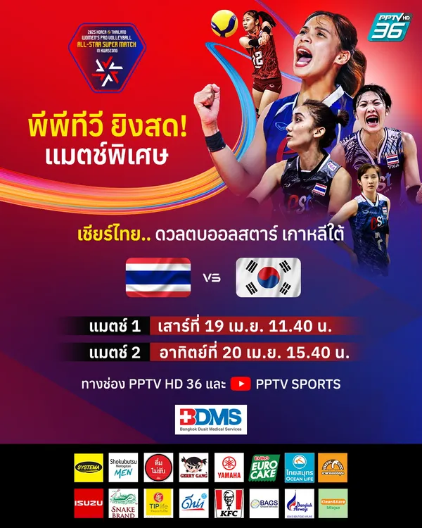 พีพีทีวี เอชดี ช่อง 36 เตรียมถ่ายทอดสดการแข่งขันวอลเลย์บอลหญิงรายการพิเศษ “2025 Korea-Thailand Women’s Pro Volleyball All-Star Super Match in Hwaseong” ซึ่งจะจัดขึ้นระหว่างวันที่ 19–20 เมษายน 2568 ณ เมืองฮวาซอง ประเทศเกาหลีใต้