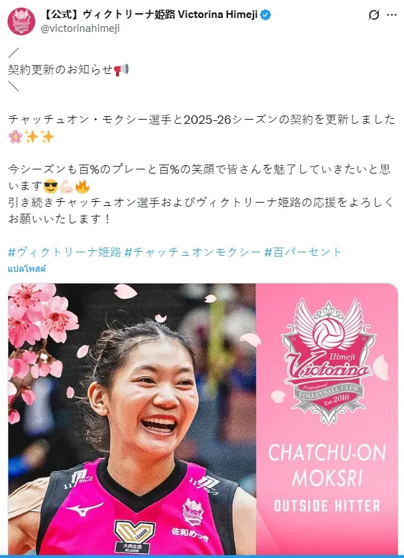 "บุ๋มบิ๋ม" ชัชชุอร โมกศรี นักวอลเลย์บอลหญิงทีมชาติไทย จะยังคงสวมเสื้อสโมสรวิคโตรินะ ฮิเมจิ ลุยศึกเอสวี.ลีก ญี่ปุ่น ในฤดูกาล 2025-26 นับเป็นการลงเล่นปีที่สามติดต่อกัน หลังจากโชว์ฟอร์มได้อย่างโดดเด่นและเป็นกำลังสำคัญในการพาทีมประสบความสำเร็จมาแล้ว
