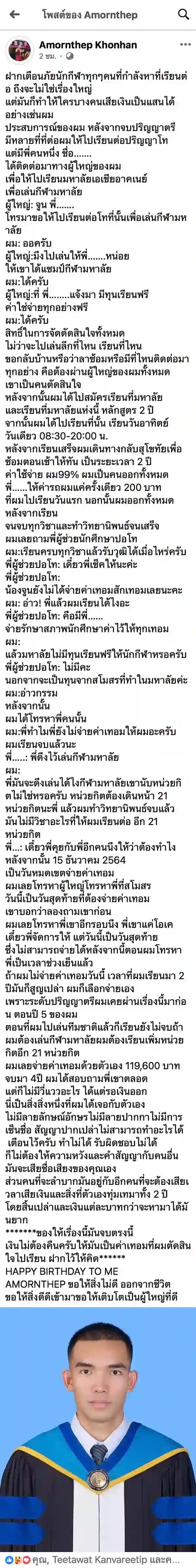 เรื่องนี้ อมรเทพ ได้โพสต์ผ่านเฟสบุ๊กส่วนตัว Amornthep Khonhan ในวันที่ 6 ต.ค.68 ซึ่งเป็นวันเกิดของเจ้าตัวและอายุครบ 30 ปีในวันนี้พอดี ได้โพสต์มีใจความคร่าวๆว่า เตือนภัยนักกีฬาทุกคนที่กำลังหาที่เรียนต่อ แต่มันอาจเสียเงินเป็นแสนได้เหมือนที่เจ้าตัวเคยโดนเมื่อ 4 ปีที่แล้ว