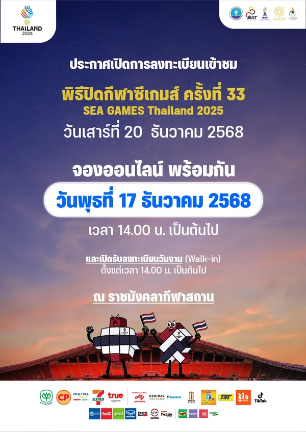คณะผู้จัดงาน ซีเกมส์ ครั้งที่ 33 ประกาศเปิดลงทะเบียนเข้าชมพิธีปิดการแข่งขัน SEA GAMES 2025 ณ สนามราชมังคลากีฬาสถาน เริ่มจองออนไลน์ 17 ธ.ค. นี้ พร้อมเปิดรับ Walk-in หน้างาน